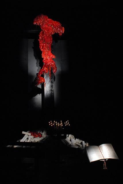 Avvolta in un’atmosfera spirituale e di grande forza emotiva, una croce nera si innalza per sette metri e mezzo sopra ad un cumulo di pietre e macerie, attirando lo sguardo attento di un pubblico sorpreso. Su di essa è inchiodata una Italia che sembra sciogliersi e scivolare via. E’ rossa come il sangue. Un’immagine intensa e drammatica di un Paese stanco e ferito. Ad illuminare la scena sono le luci tenue di candele bianche rosse e verdi. Inginocchiatoi, banchi da chiesa e un leggio – che sorregge la Costituzione – circondano il crocifisso, trasformando uno spazio creativo in un luogo di riflessione.